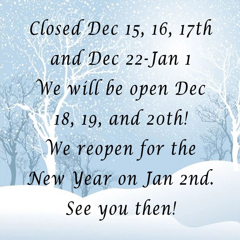 In the event of weather related or Holiday closings, information will be posted here and on social media if we are able to connect to our website. We will have a closings on most major holidays and over Thanksgiving and Christmas. We will be closed from Dec 15-17th and Dec 22- Jan 1st for Christmas and New Years. Check back here for exact dates and any further closings.